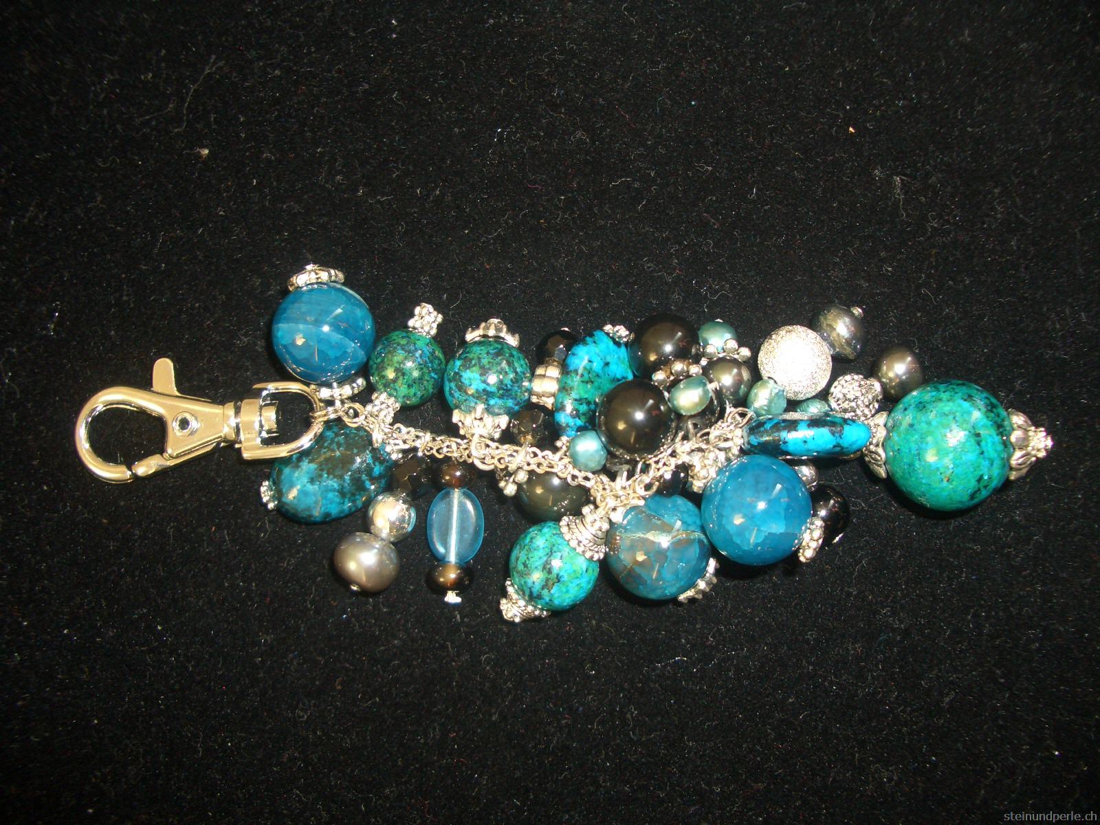 Für diesen Anhänger wurden Azurit - Malachit Steine in verschiedenen Formen und Grössen, Onyx und petrolfarbener Achat sowie blau und grau schimmernde Perlen und silberfarbene Metallaccessoires verarbeitet.