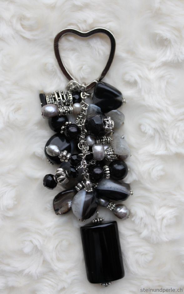 Zahlreiche Steine in der Farbkombination schwarz - weiss, silbergraue Perlen und zahlreiche silberfarbene Accessoires wurden für diesen Anhänger verarbeitet. Der grösste Stein ist 3 cm lang und 2 cm breit!