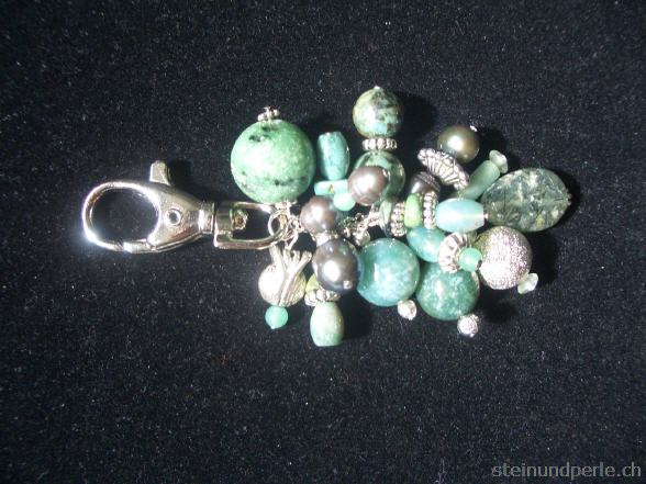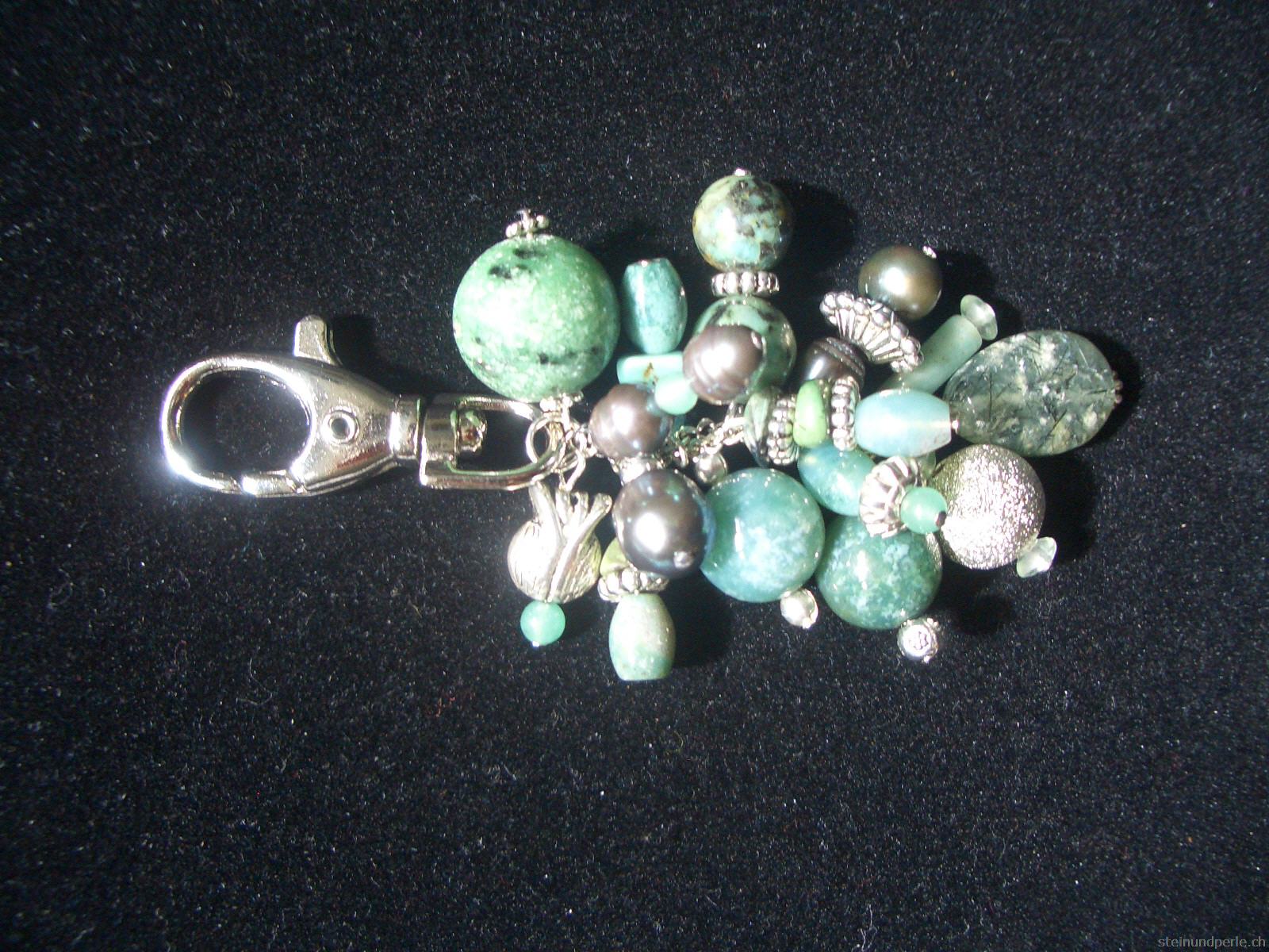 Der Anhänger ist aus zahlreichen grünen Steinen in verschiedenen Formen und Grössen, schimmernden Perlen und silberfarbenen Metallaccessoires gefertigt.