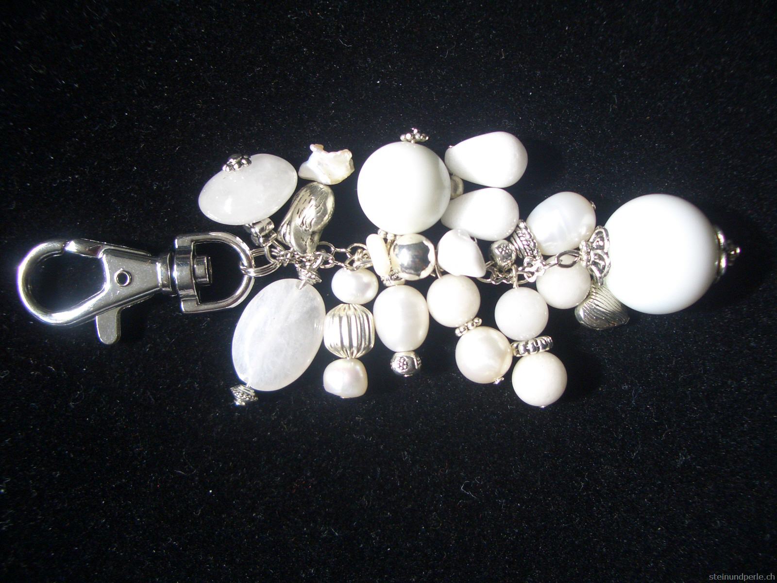 Weisse Steine, zahlreiche Perlen und silberfarbene Metallaccessoires - dieser Anhänger ist ein Traum in Weiss!