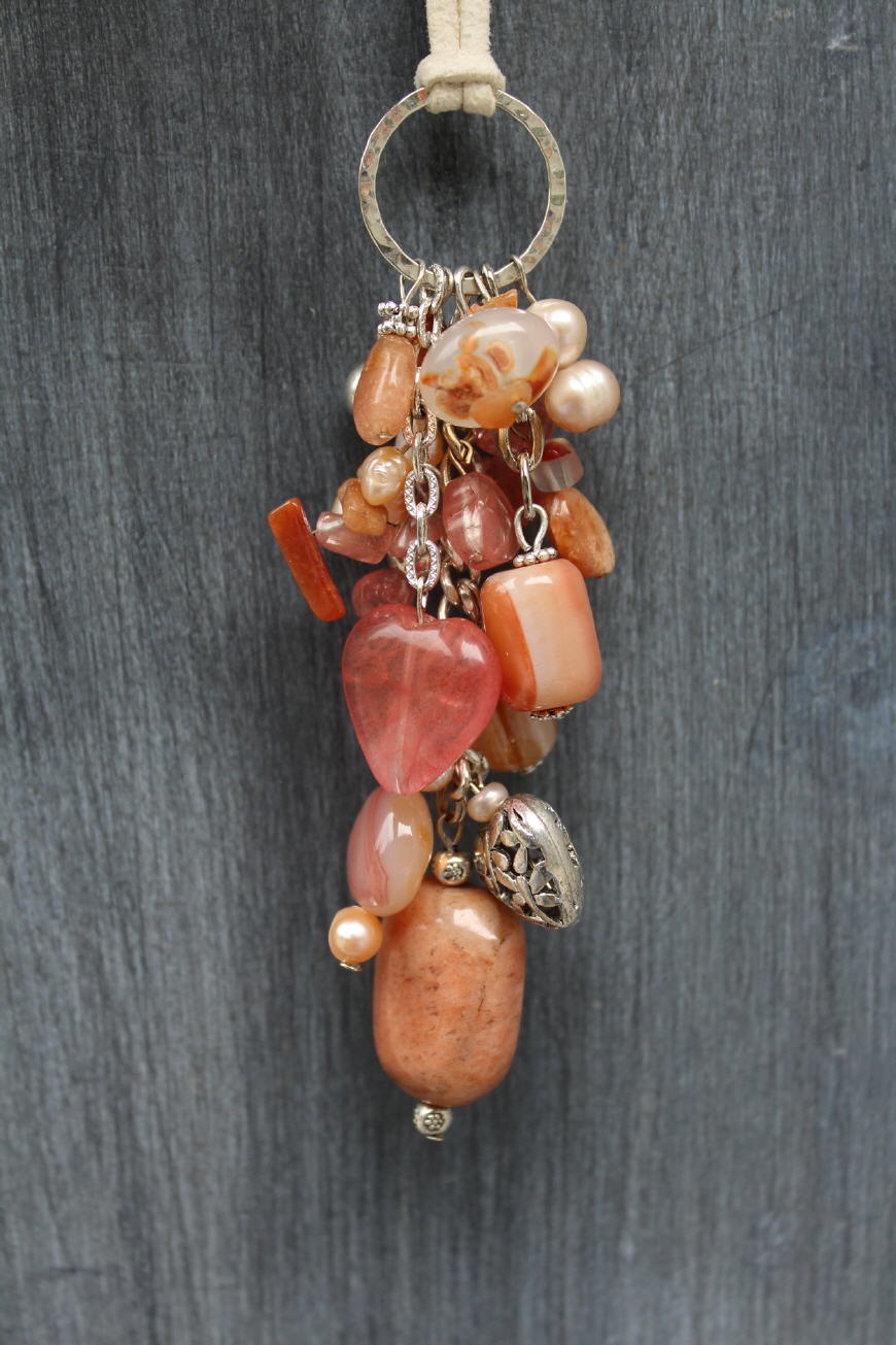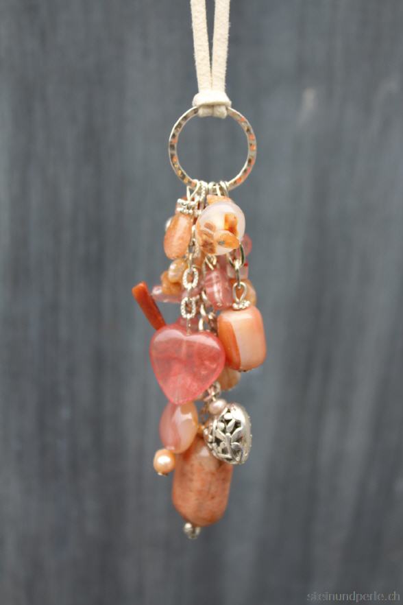 Gehämmerter Silberring mit gemischten hellroten Steinen (Rubellit, Achat) in unterschiedlichen Grössen und Formen dazu weisse und apricotfarben schimmernde Süsswasserperlen und silberfarbene Accessoires.