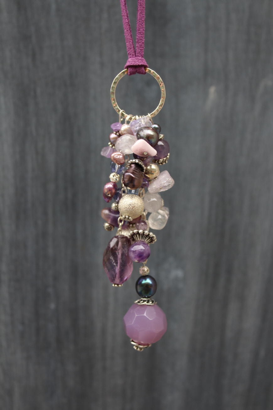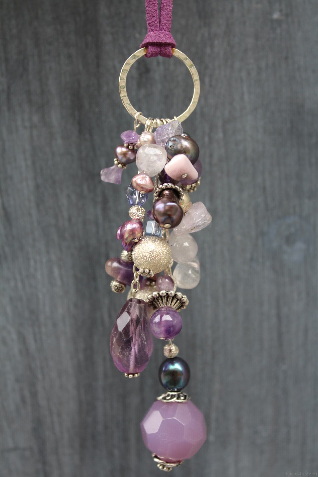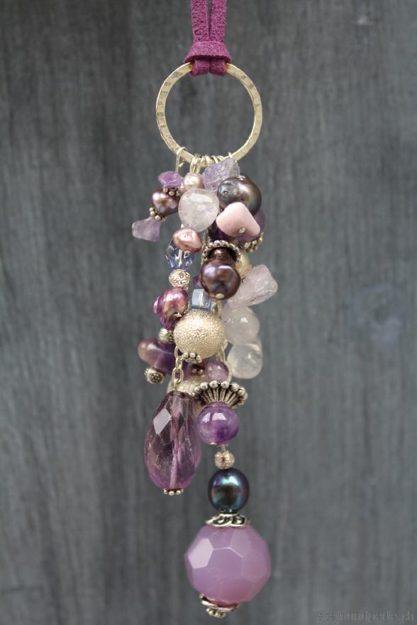 Gehämmerter Silberring mit gemischten lila Steinen in unterschiedlichen Grössen und Formen dazu violett schimmernde Süsswasserperlen und silberfarbene Accessoires.