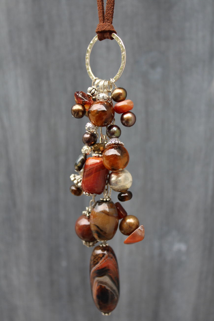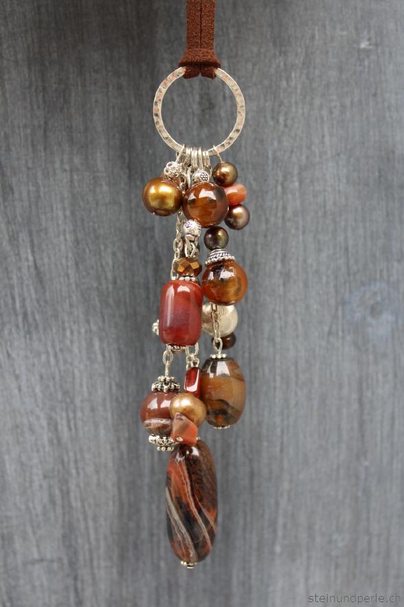 Gehämmerter Silberring mit gemischten orangen und braunen Steinen (Sarder, Achat) in unterschiedlichen Grössen und Formen dazu goldbraun schimmernde Süsswasserperlen und silberfarbene Accessoires.