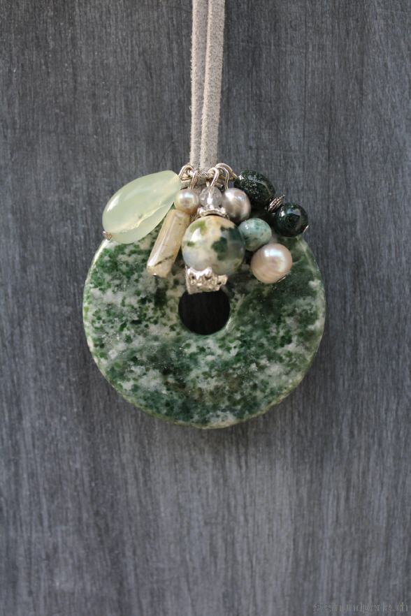 Ergänzt wird der Anhänger durch verschiedene grüne Steine, silbern schimmernde Süsswasserperlen, silberfarbene Metallaccessoires und einem hellen Kristall.