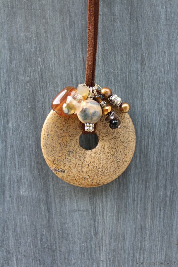 Der Anhänger ist an einem dunkelbraunen Alcantaraband befestigt das am Ende eine grosse Perle trägt.
