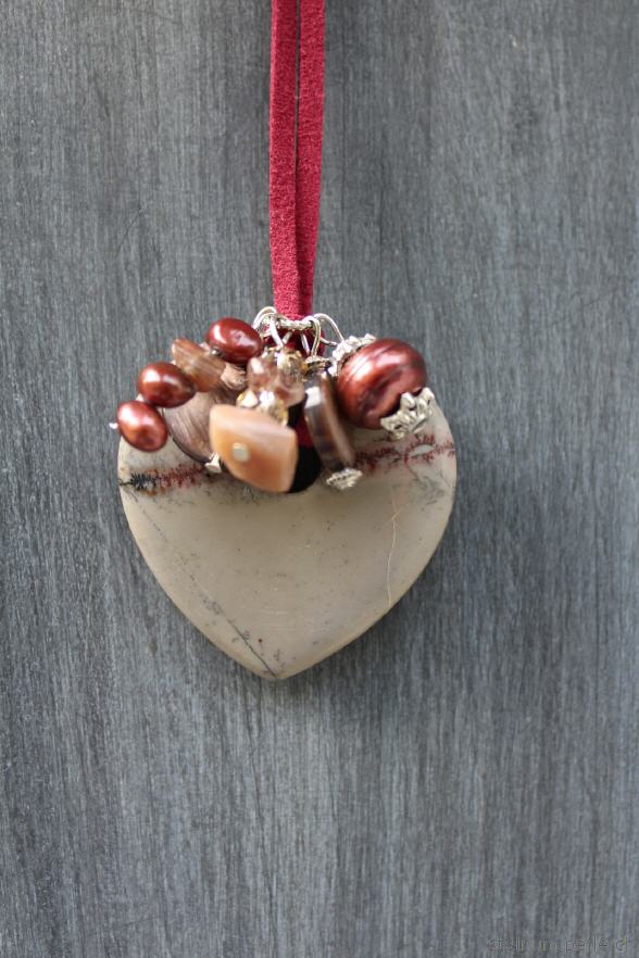 Das Herz ist aus grauem Landschaftsjaspis mit einem Streifen aus dunkelrot und schwarz. Ergänzt wird es durch verschiedene Steine, zwei Perlmuttscheiben und einigen Perlen sowie silberfarbenen Metallaccessoires. Bei der grossen Perle handelt es sich um eine sogenannte "Fireball"; einer gerillten Süsswasserperle in einem kräftigen dunkelrot mit schönem Lüster.