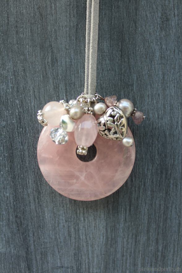 Ergänzt wird der Anhänger durch einige Rosenquarzsteine, silbern schimmernde Süsswasserperlen, silberfarbene Metallaccessoires und helle Kristalle.