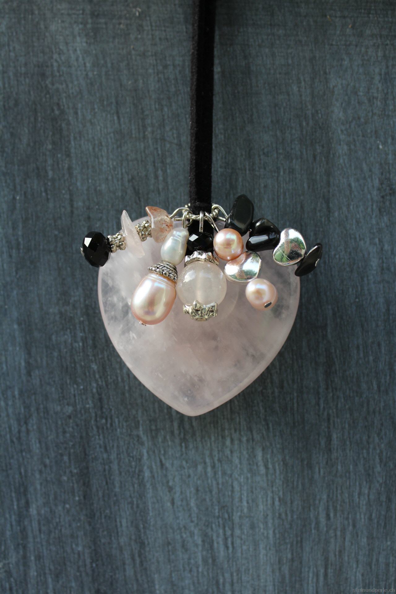 Das Herz wird durch verschiedene Rosenquarz und Onyx Steine, rosé und weiss schimmernde Süsswasserperlen und silberfarbene Metallaccessoires ergänzt.