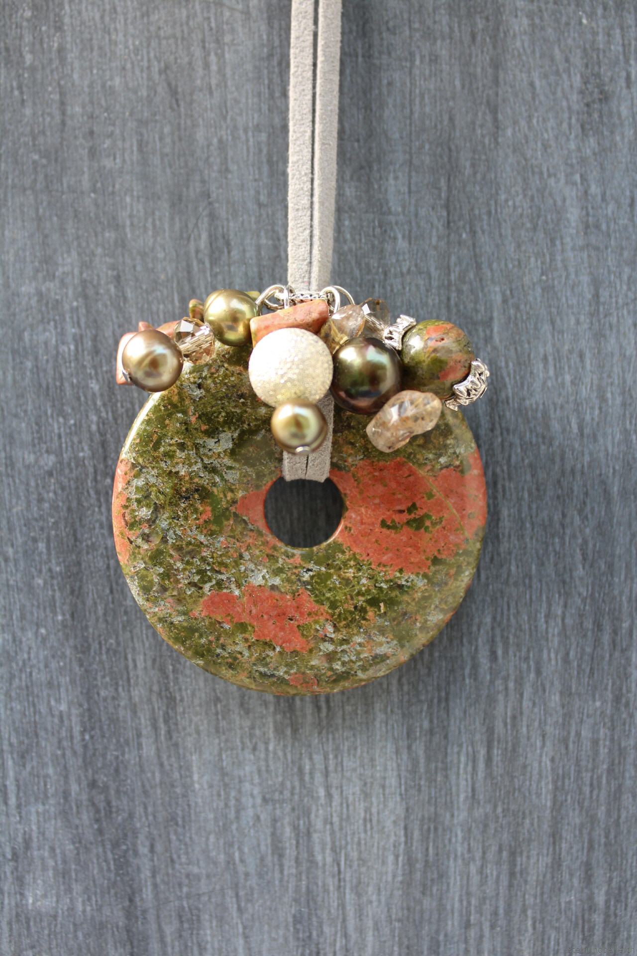 Ergänzt wird der Anhänger durch einige Unakitsteine, grünlich schimmernde Süsswasserperlen, silberfarbene Metallaccessoires und helle Kristalle.