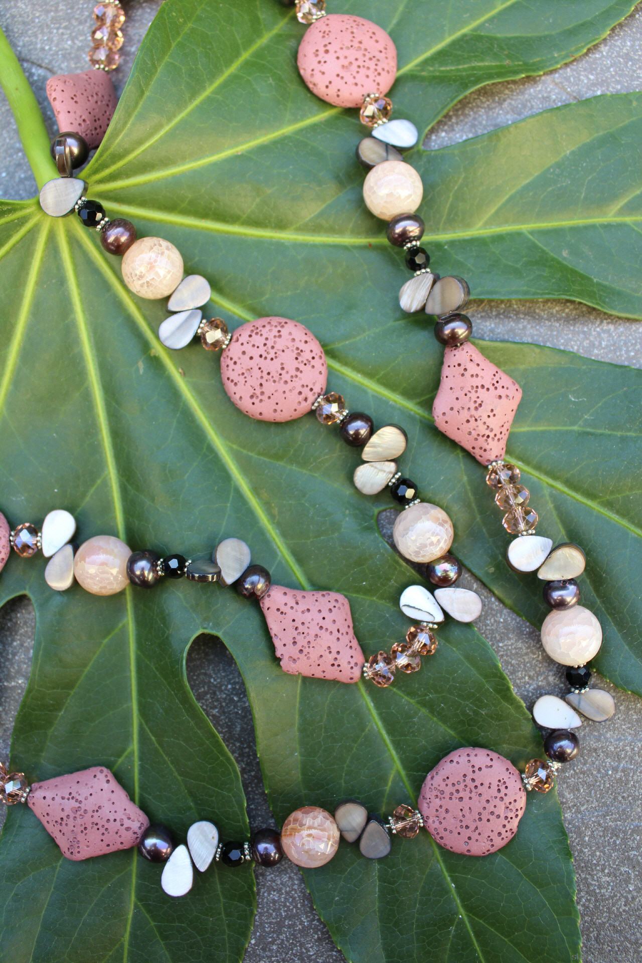 Lange Kette aus porösen altrosafarbenen Steinen, lachsfarbenen Achatkugeln, Perlmutt und Perlen.