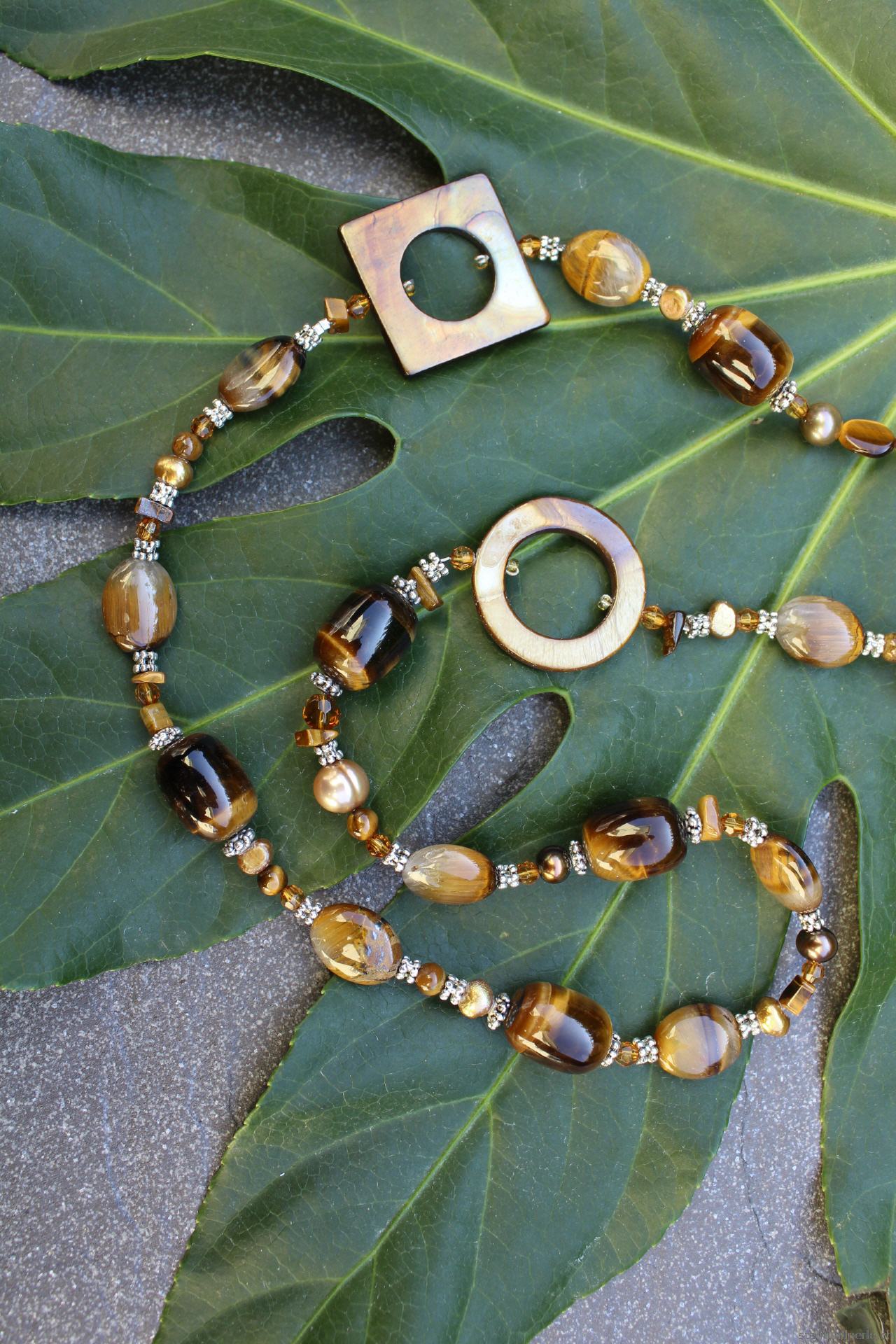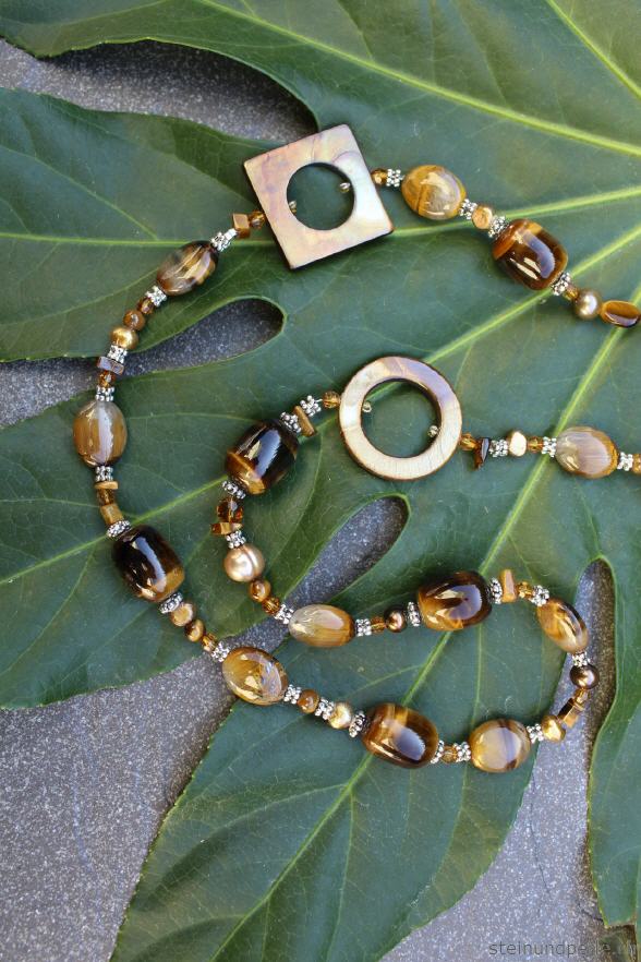 Ein Traum in Brauntönen - diese Kette ist aus zahlreichen Tigeraugesteinen in unterschiedlichen Formen und Grösse gefertigt. Zudem wurden golden - braun schimmernde Süsswasserperlen, braune Kristalle und silberfarbene Accessoires verarbeitet.