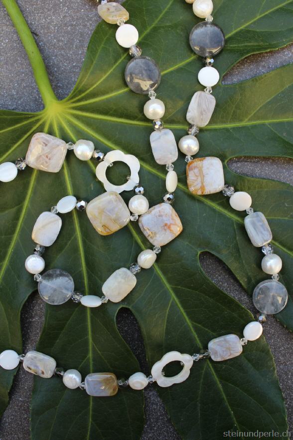 Diese Kette ist aus hellen beige- und graufarbenen Jaspissteinen, Achat und Quarz in unterschiedlichen Formen (bis 2.5 cm lang) sowie silbernen Kristallen und weiss schimmernden Süsswasserperlen gefertigt.