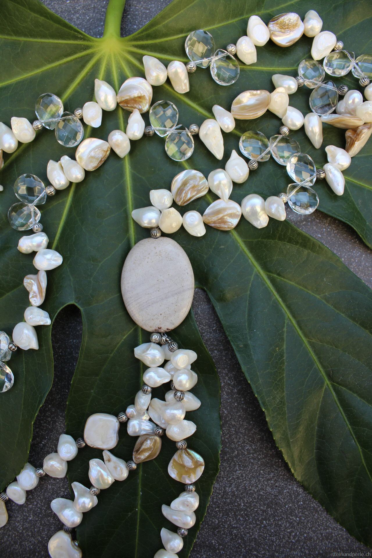 Die Quaste ist aus einem grossen ovalen beige - grauen Jaspisstein (Länge 4 cm) und weissen Perlen sowie hellen Muschelstückchen gefertigt.