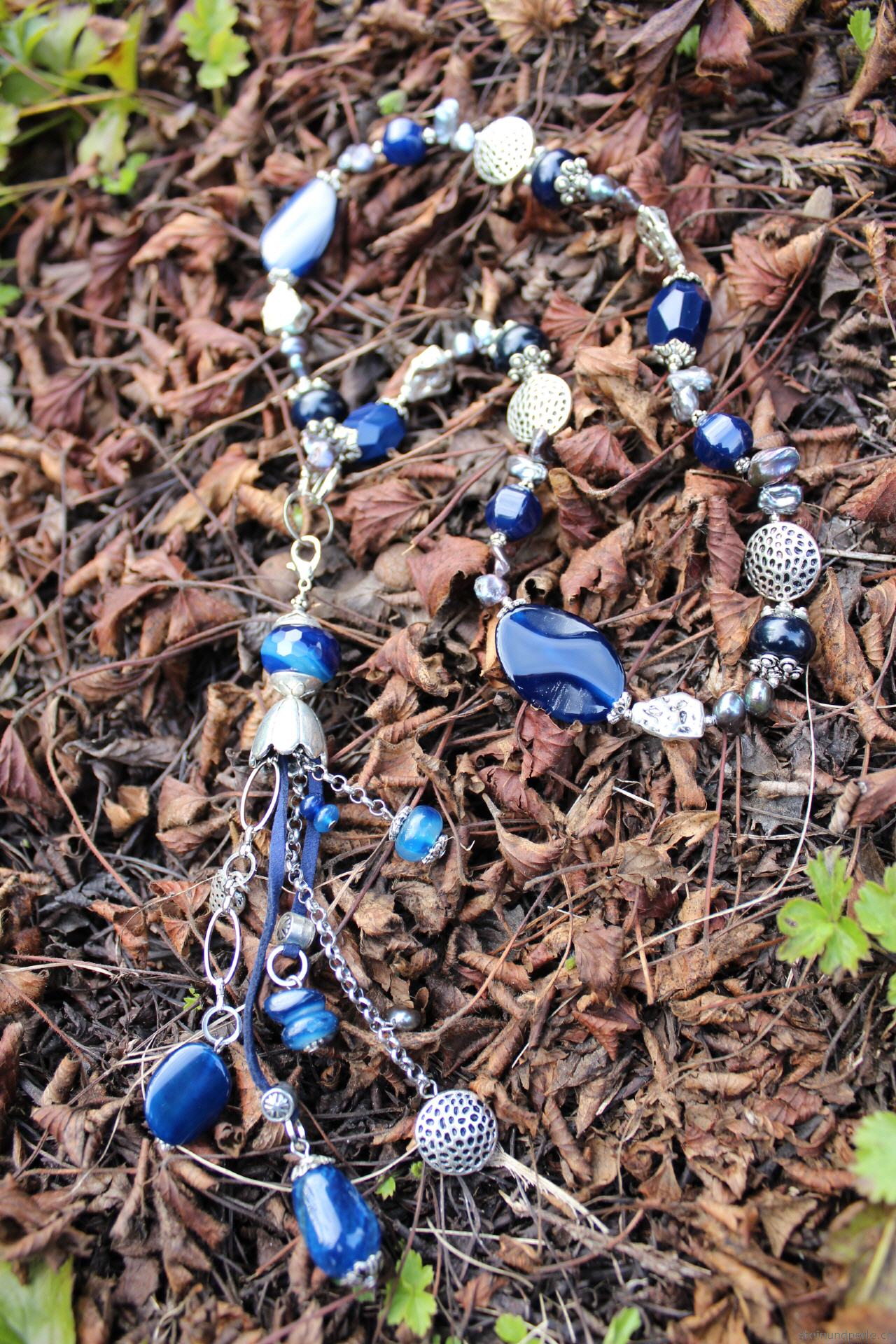 Diese Kette erinnert an das Meer - tiefblaue Steine aus Achat in verschiedenen Formen (bis 3cm lang), violette Perlen und silberfarbene Metallaccessoires verführen zum Träumen.