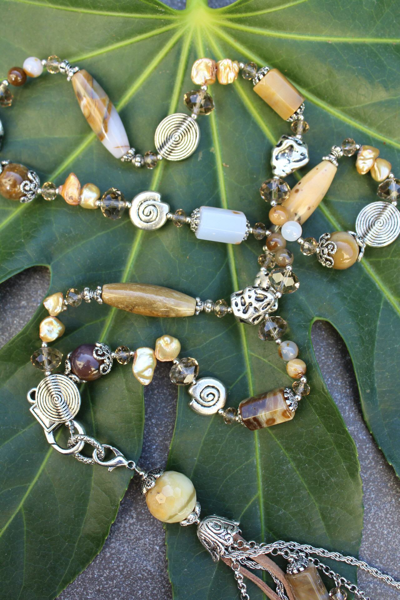 Diese tolle Kette ist aus Achat, Septarie und anderen Steinen gefertrigt. Zusätzlich wurden silberfarbene Metallaccessoires, goldfarbene Süsswasserperlen und glitzernde Kristalle verwendet.