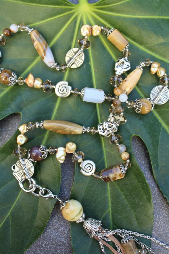 Lange Kette aus Achat, Septarie und Perlen sowie Kristallen und silberfarbenen Accessoires.