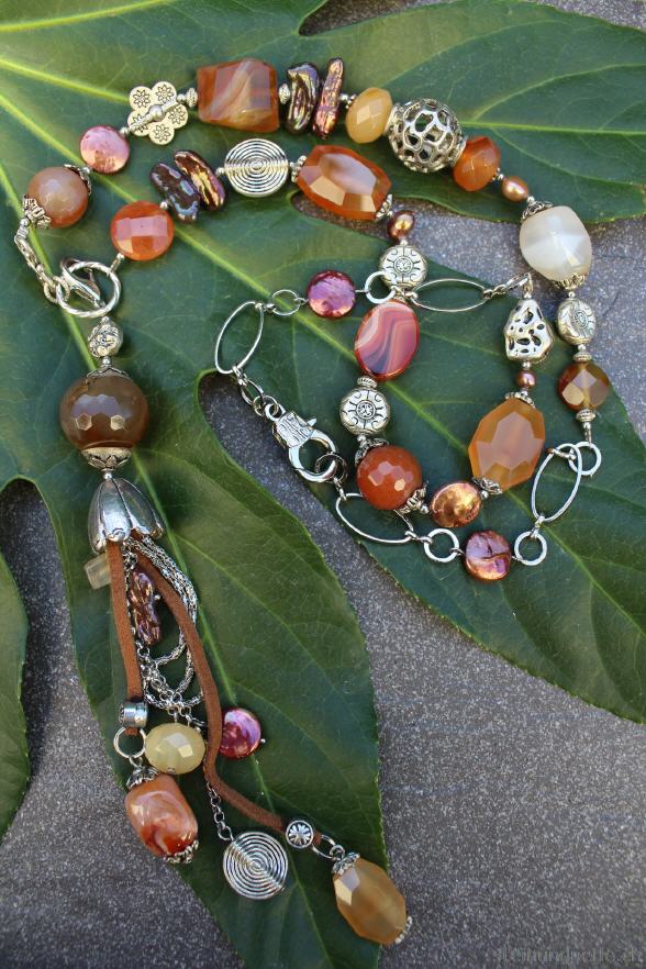 Kette aus Sarder, Achat und Perlen mit silberfarbenen Accessoires.
