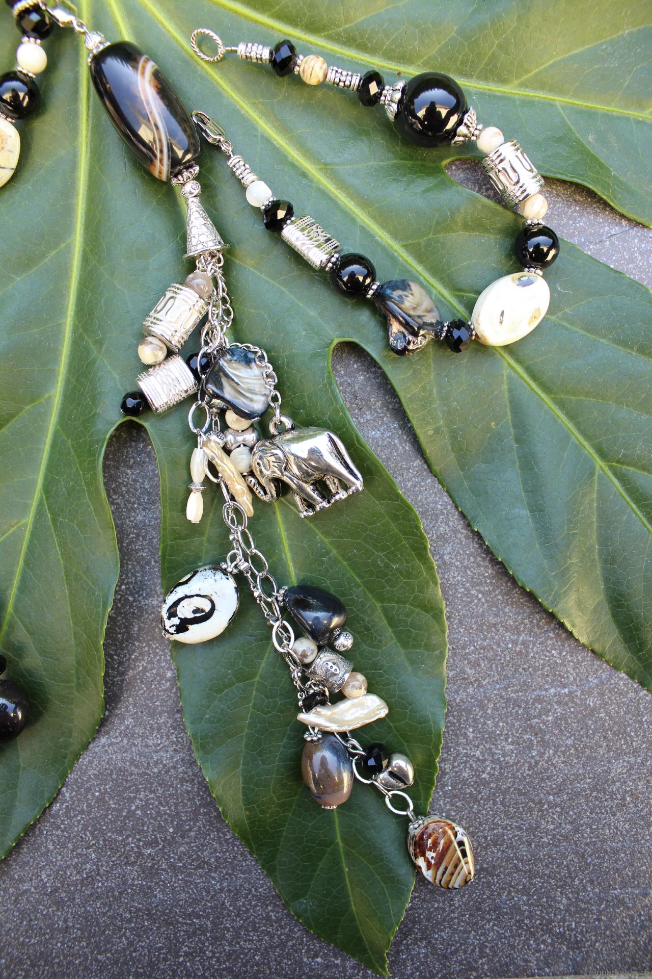 Die Kette ist aus Obsidian und Septarie in unterschiedlichen Formen und Grössen sowie Perlen und silberfarbenen Accessoires gefertigt. Zusätzlich wurden Muschelschalen und schwarze Kristalle verwendet.