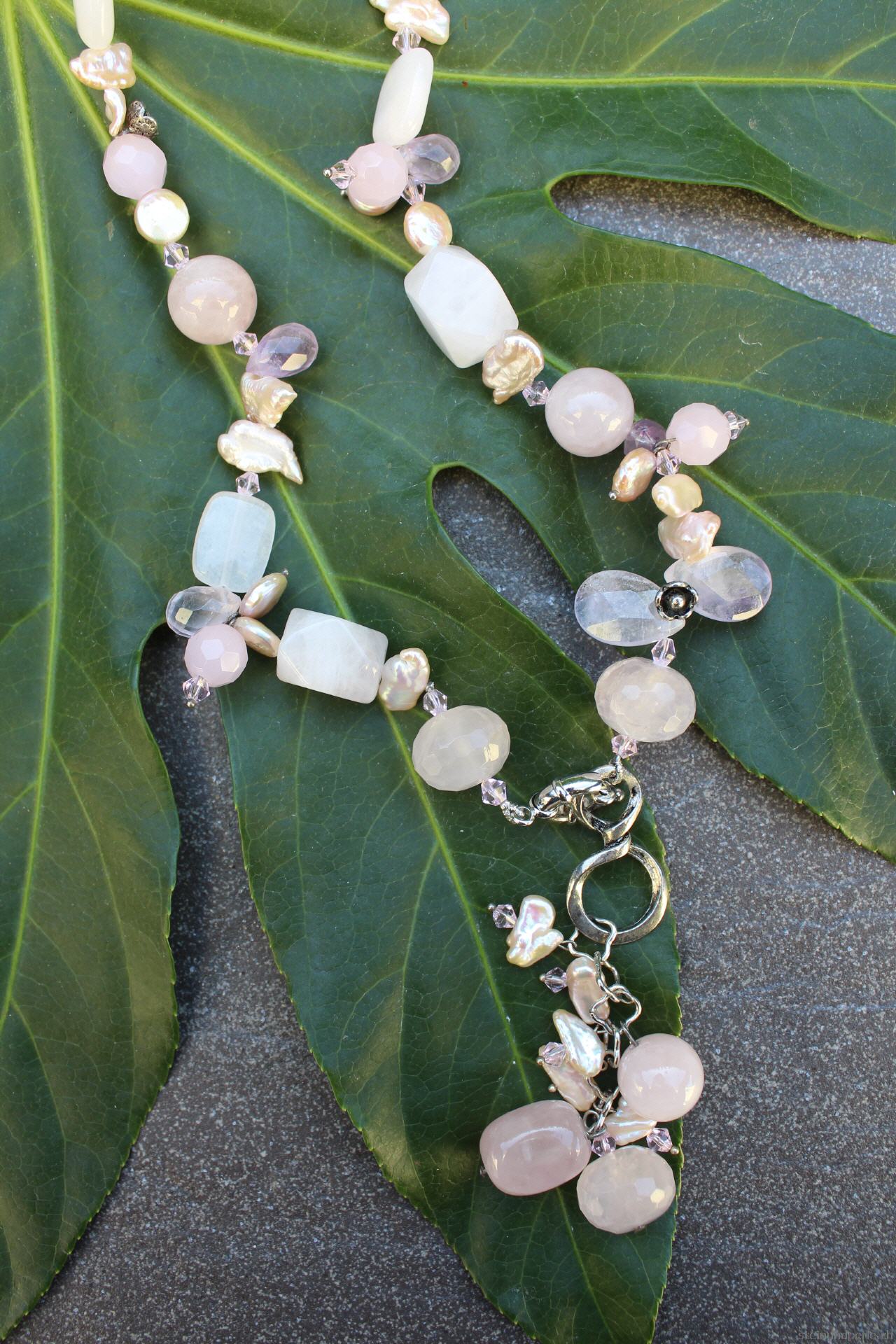Die Kette ist aus Rosenquarz in unterschiedlichen Formen (bis 1.7 cm lang), roséfarbenen Perlen und kleinen rosa Kristallen sowie silberfarbenen Blüten und einem grossen silberfarbenen Verschluss gefertigt. Eine 8 cm lange Quaste vollendet diese Kette.