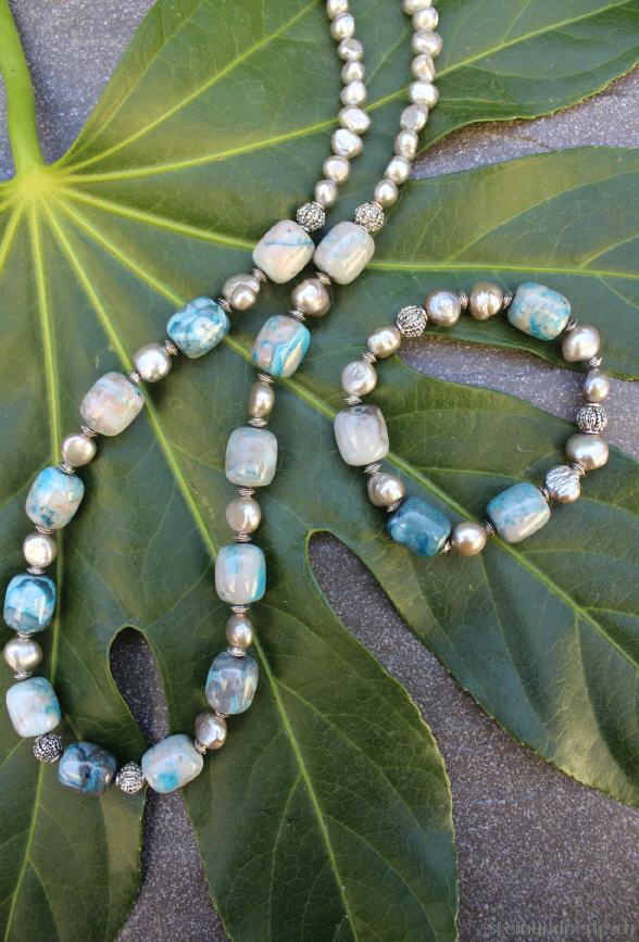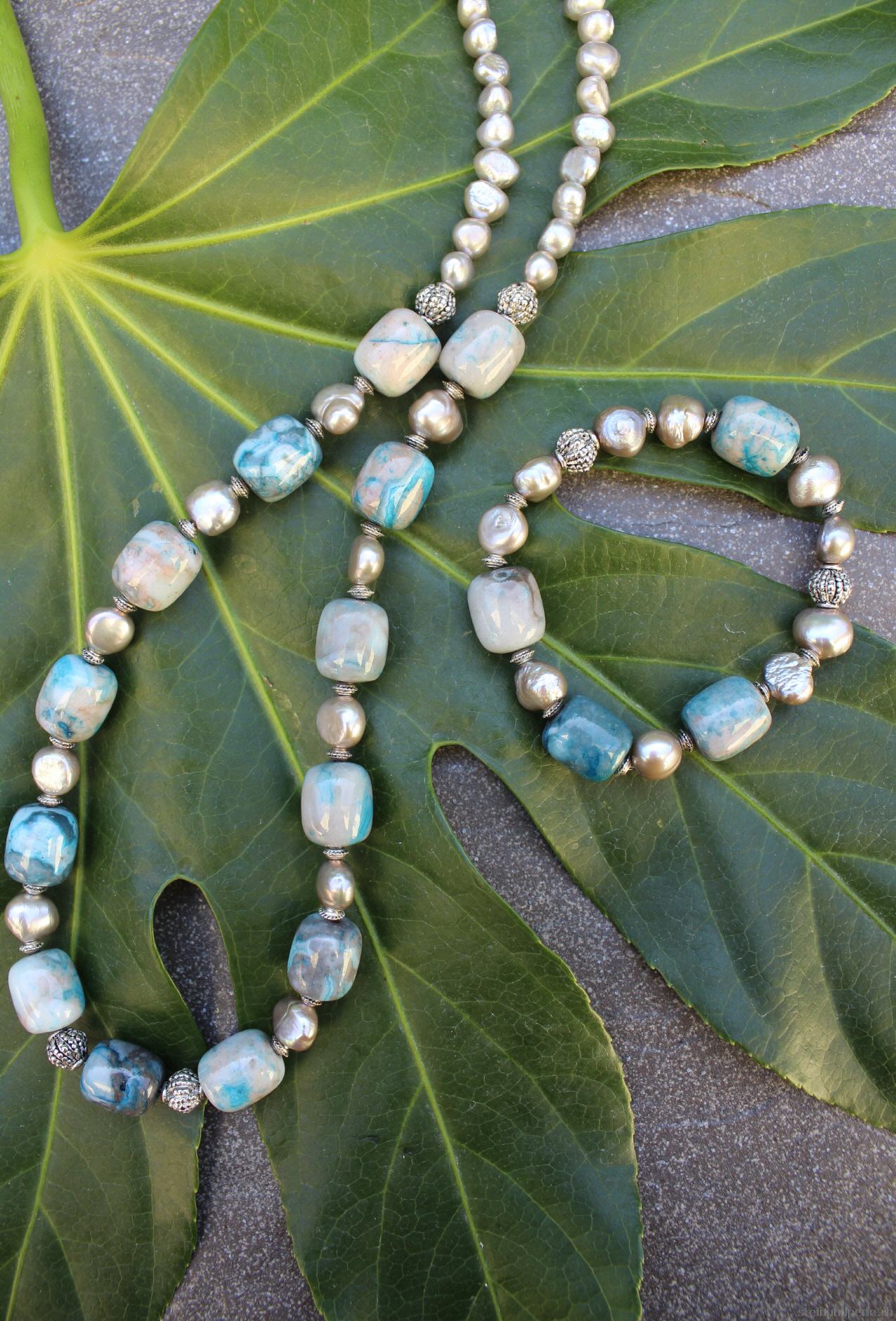 Diese tolle Kette ist aus Achat in türkisblau - silbergrauen Farbtönen und silberfarben schimmernden Perlen gefertigt. Zwischen den Steinen und Perlen wurden silberfarbene Metallaccessoires aufgefädelt.