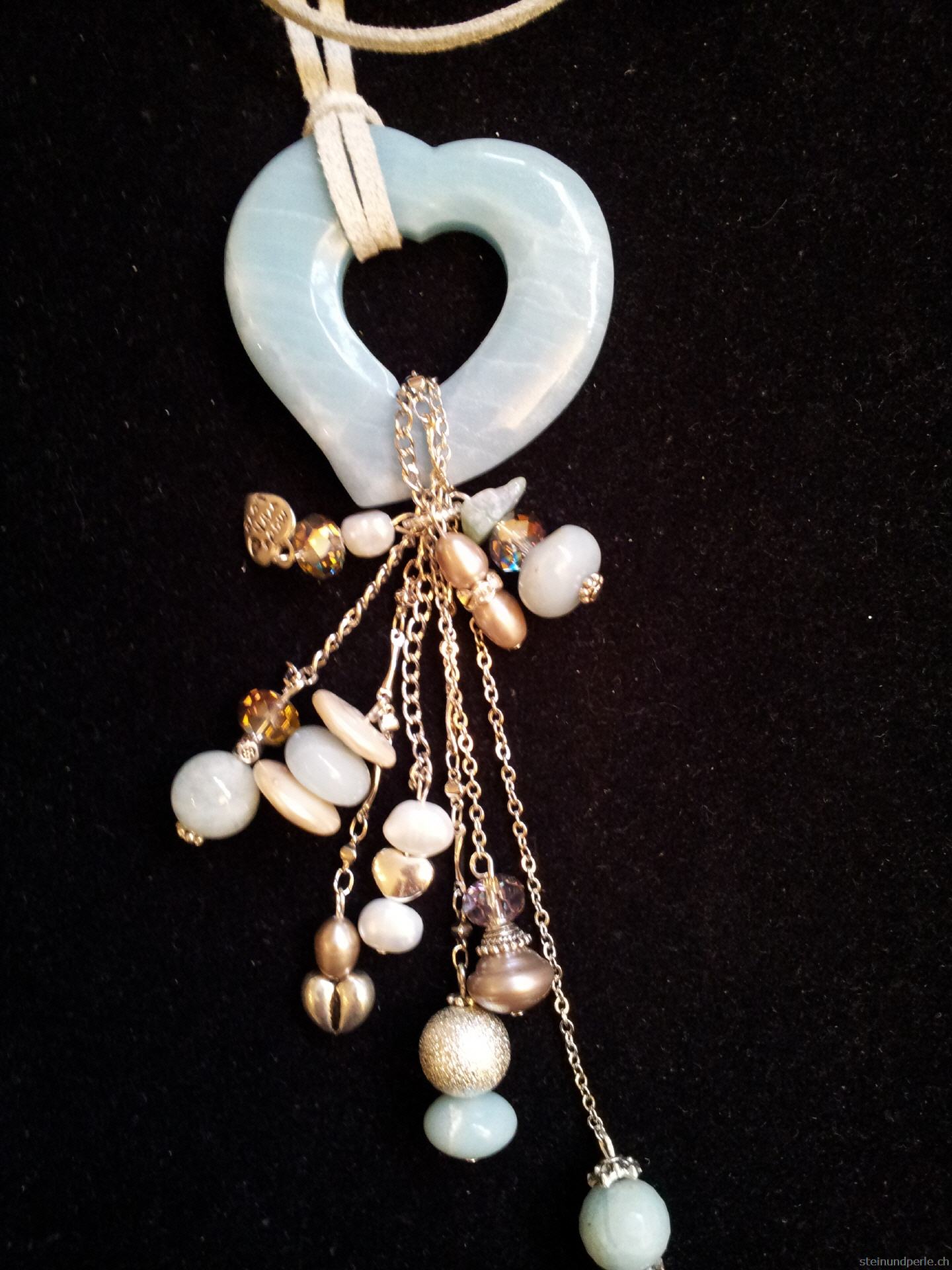 Achat Herz mit silbernen Accessoires und Süsswasserperlen.
